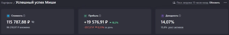 Вложено 96 210 ₽, текущая стоимость 115 669 ₽. Прибыль +19 458 ₽. Доходность 13,99%.