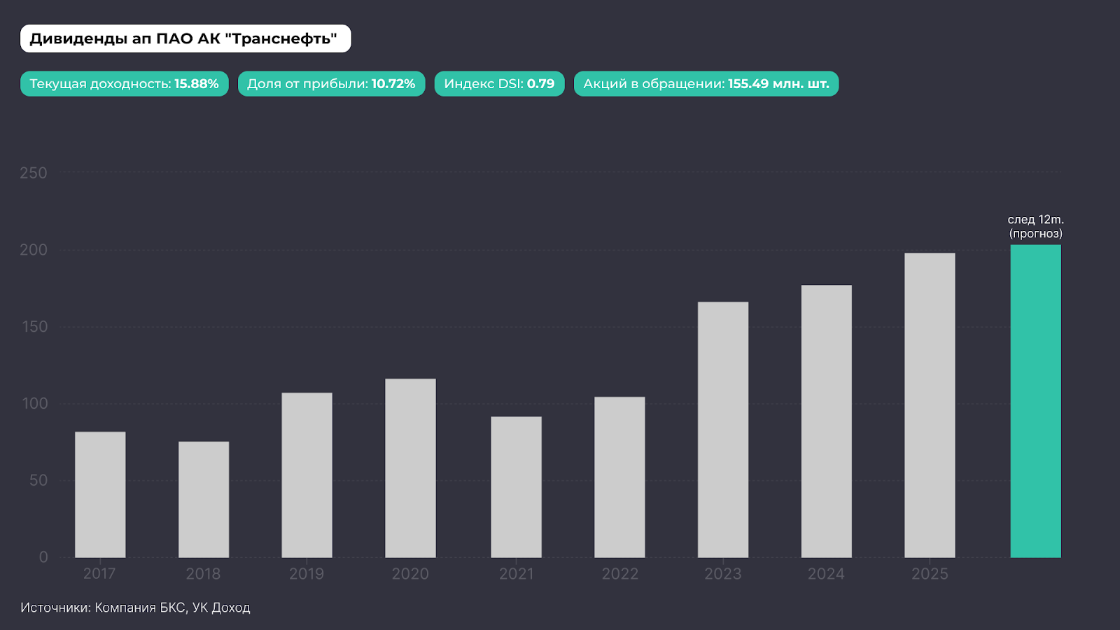 А вот Транснефть — интересная история. Компания не зависит от цен на нефть — она просто гонит ее по трубам в любое время года и зарабатывает на тарифах. Тарифы на прокачку нефти ежегодно индексируются по формуле «инфляция минус 0,1%», исходя из прогнозируемого темпа роста цен на товары и услуги.