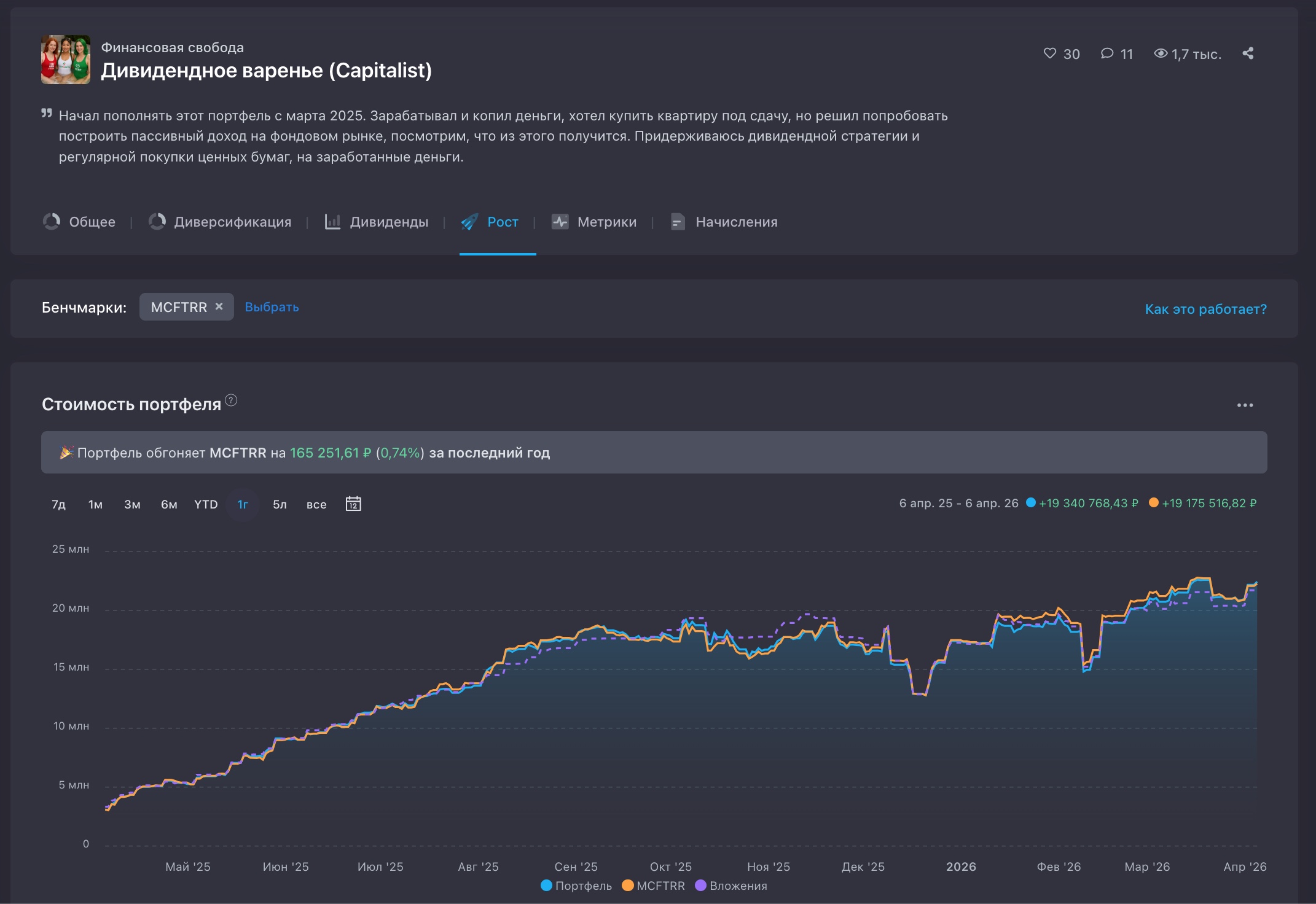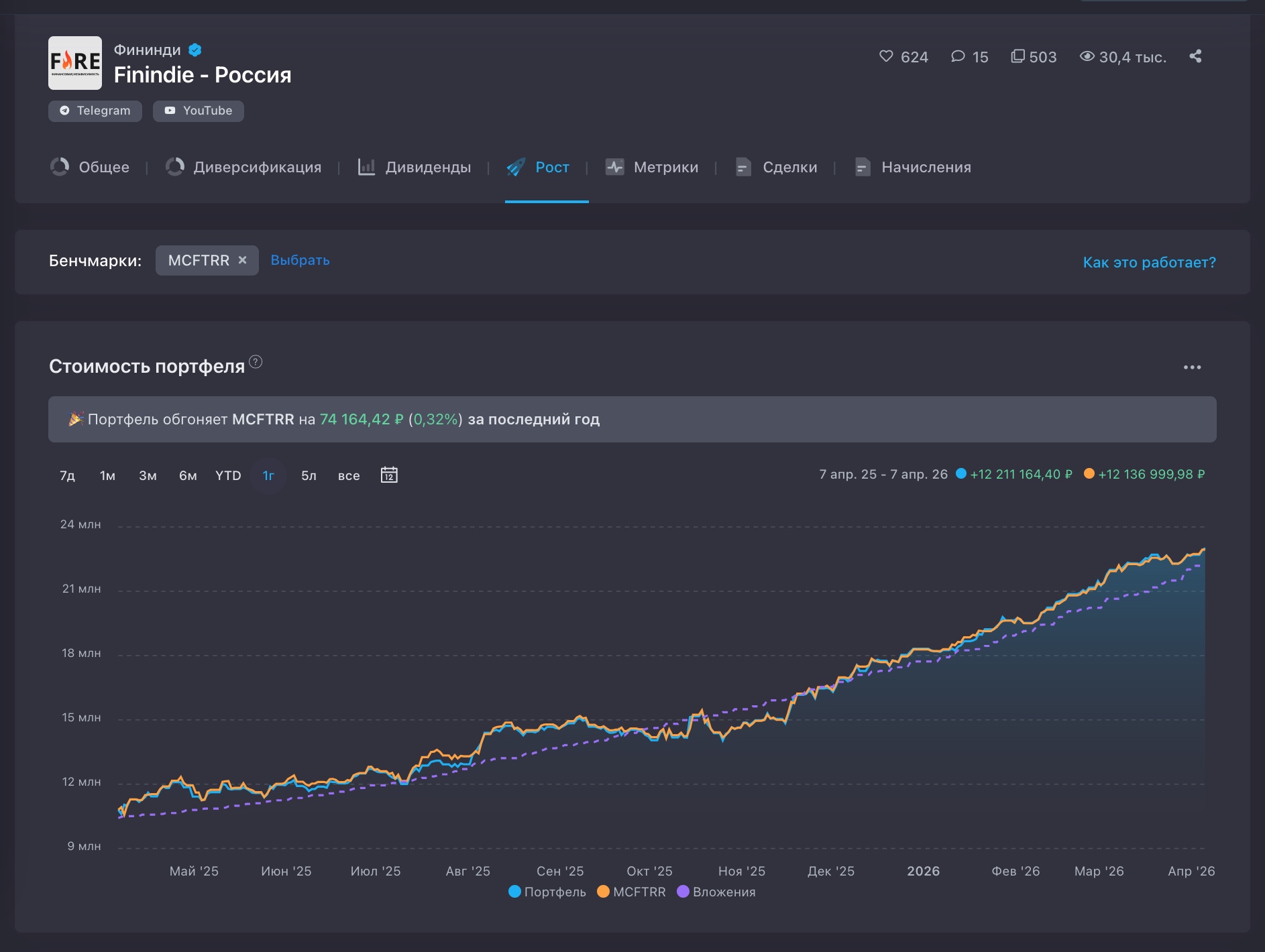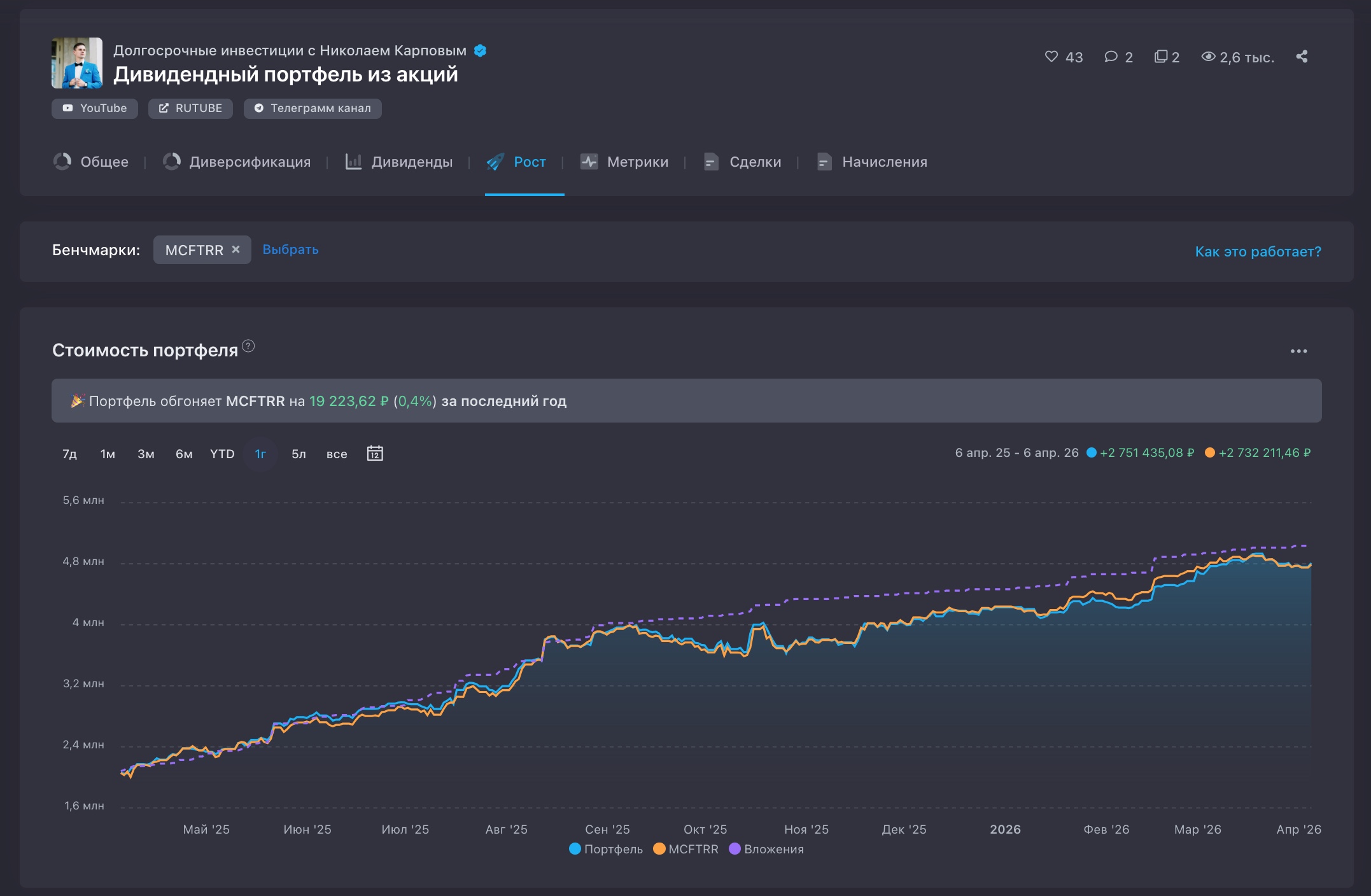 Бенчмарк — MCFTRR — индекс полной доходности Мосбиржи (с учётом дивидендов за вычетом НДФЛ). Именно он показывает, что вы получили бы просто купив рынок целиком.