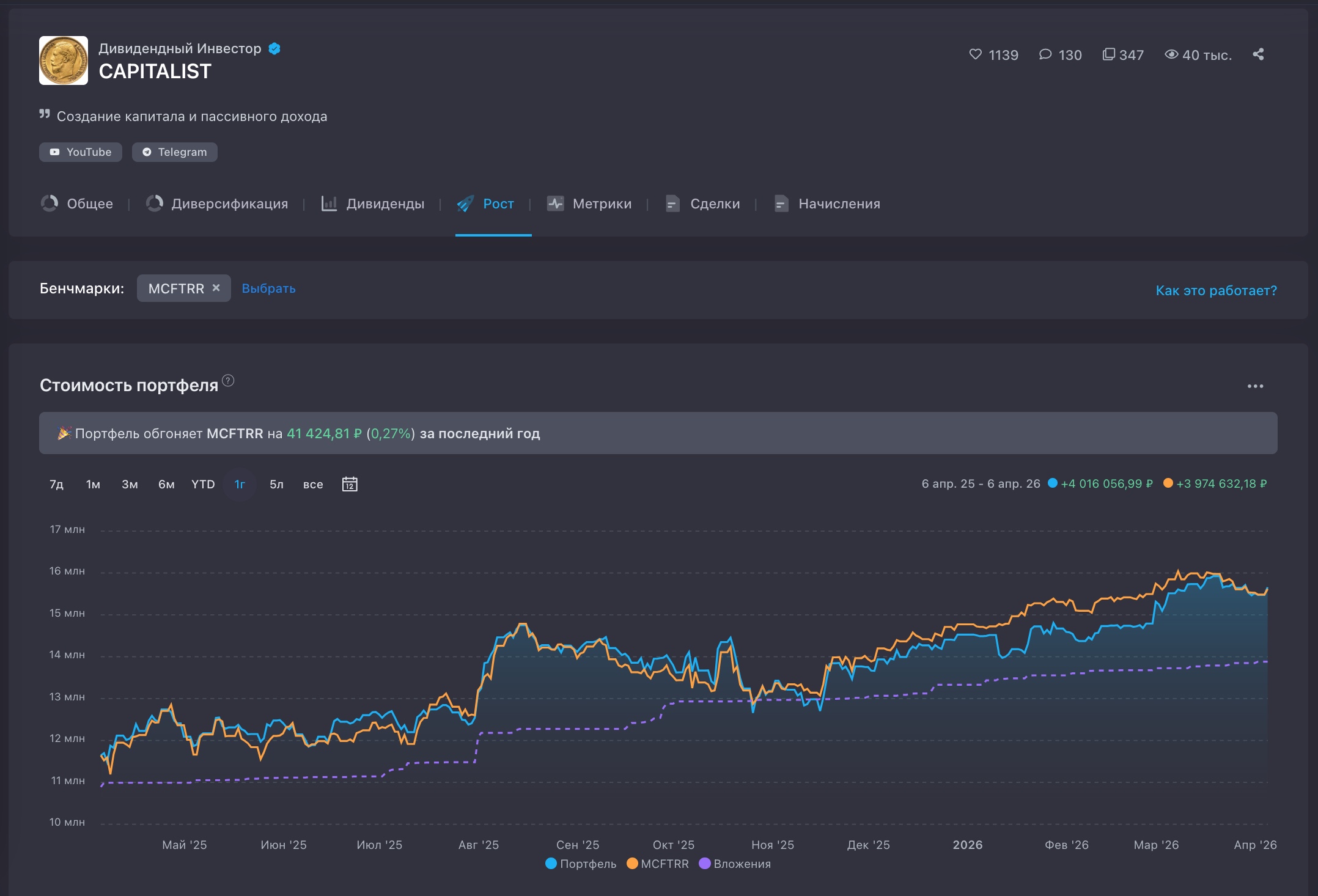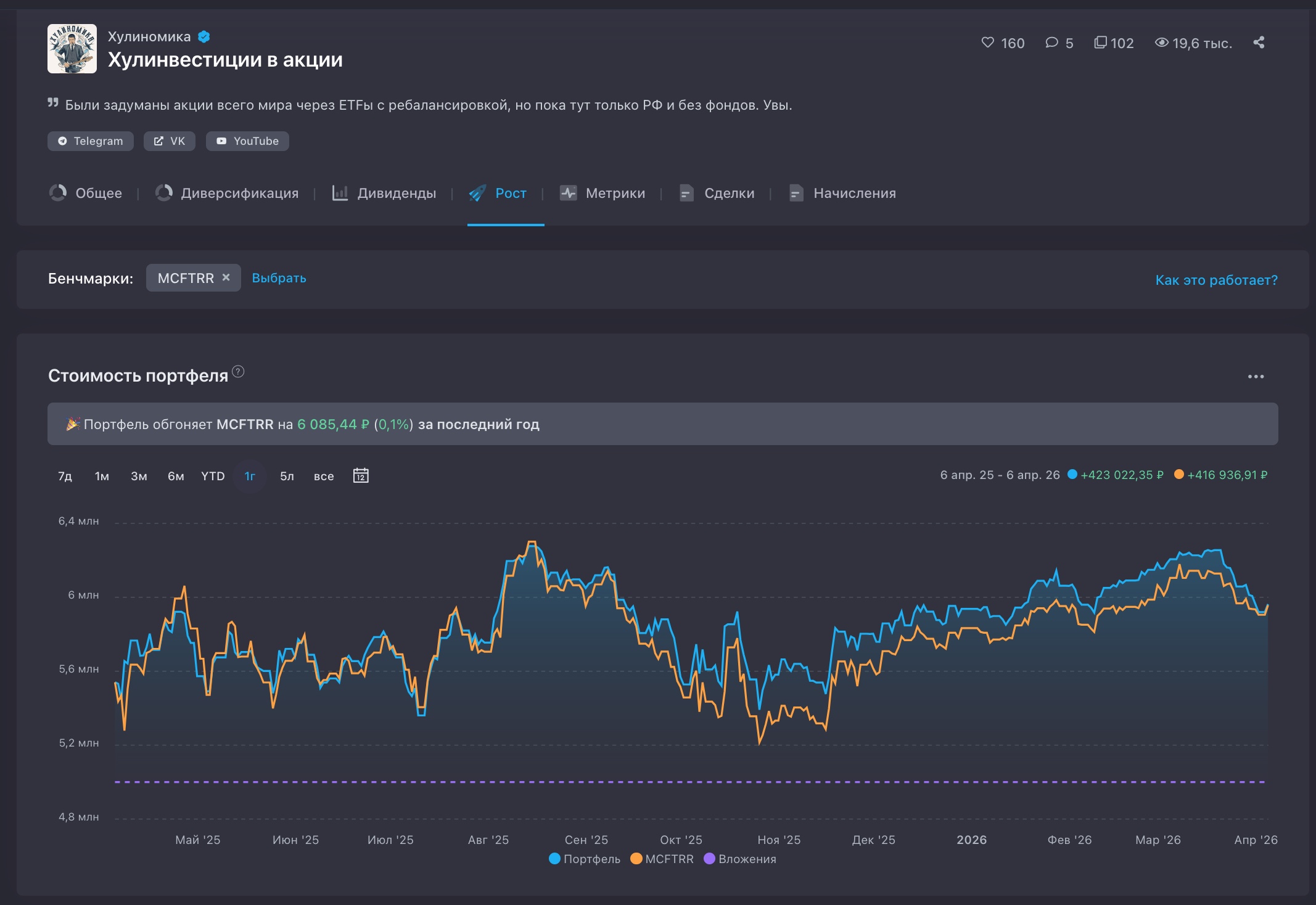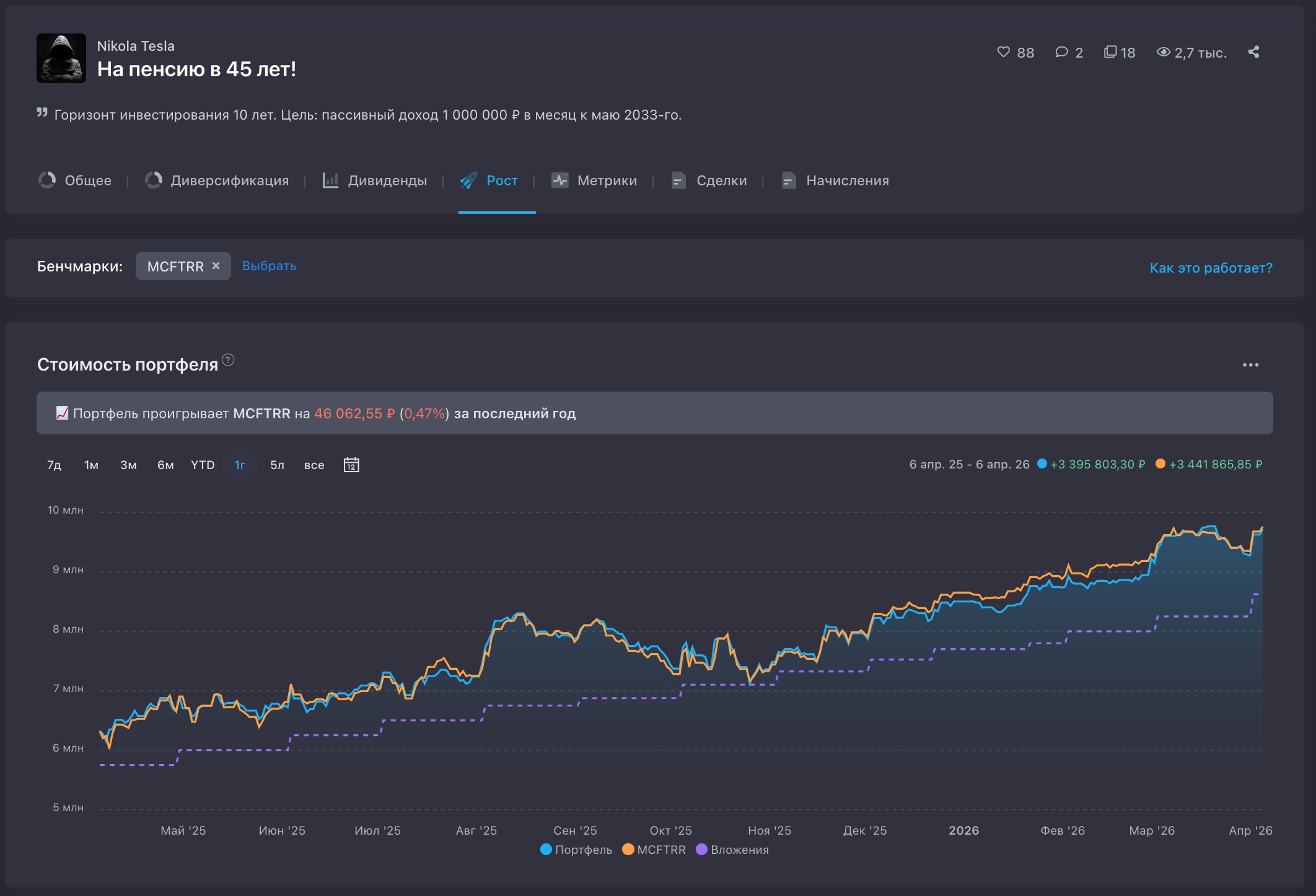 Бенчмарк — MCFTRR — индекс полной доходности Мосбиржи (с учётом дивидендов за вычетом НДФЛ). Именно он показывает, что вы получили бы просто купив рынок целиком.