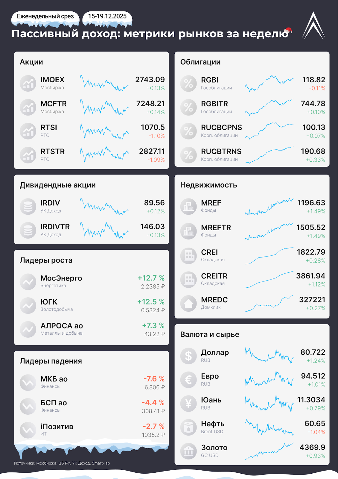 Привет, инвесторы! Готова свежая инфографика от канала «Пассивный доход» — для всех, кто ценит дивиденды, купоны и рентные платежи, в общем любит, когда деньги работают сами. Собрал самые важные цифры недели, чтобы быть в теме и держать руку на пульсе. Ключ снижен, рубль тоже.
