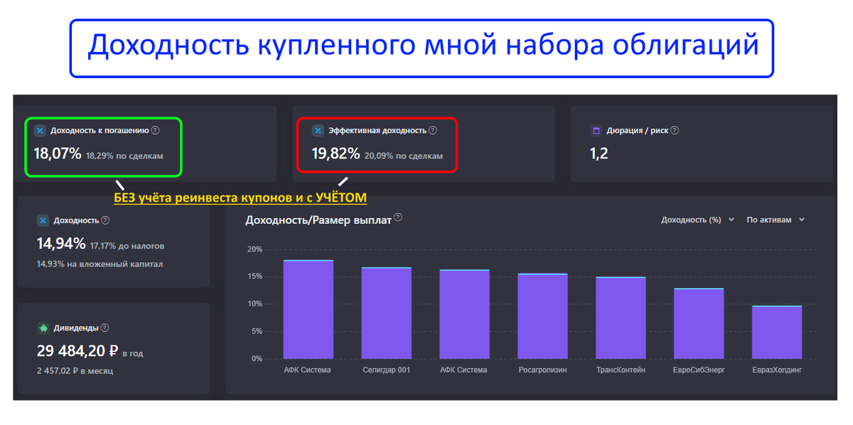 Сейчас доходность портфеля облигаций к погашению — около 18% среднегодовых без реинвеста купонов, а с реинвестом почти 20%: