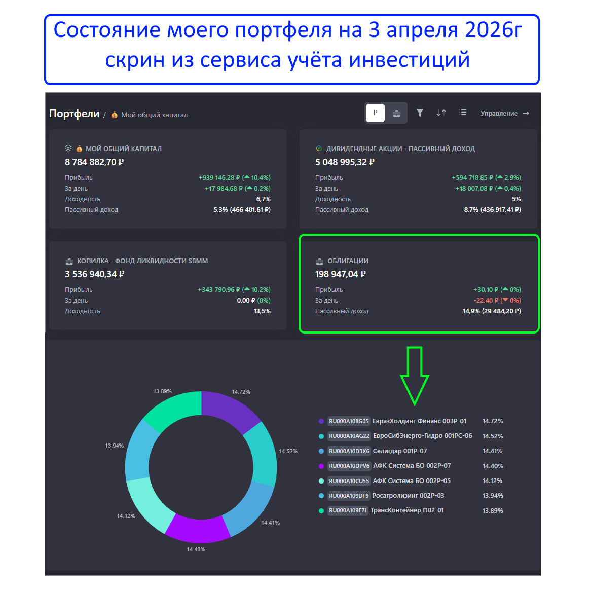 Как видите, рядом с «дивидендными акциями» и «копилкой» (фонд ликвидности) появился новый раздел — «Облигации».