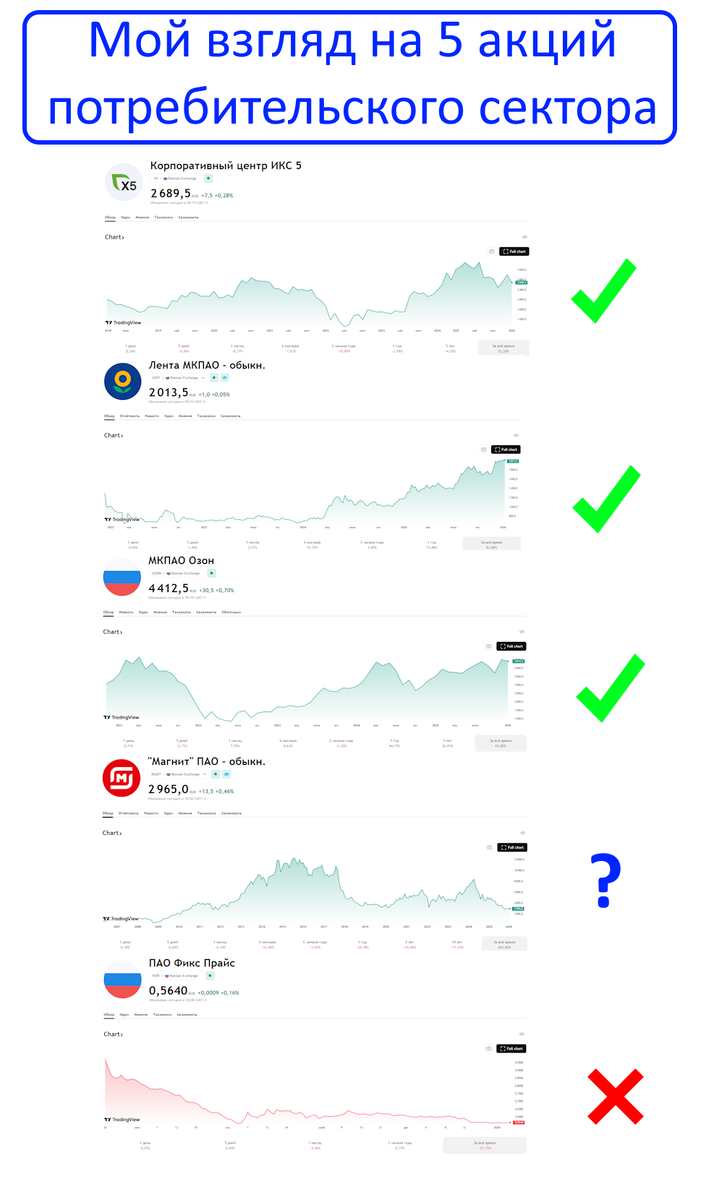 На российском рынке можно выделить пять популярных "потребительских" акций: X5, Лента, Ozon, Магнит, Fix Price. Но лично мой интерес сегодня вызывают только три из них. Давайте разбираться.