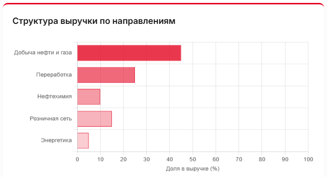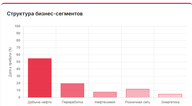 Компания демонстрирует сбалансированную структуру бизнеса с доминированием добычи и переработки нефти. Розничный сегмент показывает стабильный рост благодаря расширению сети АЗС.