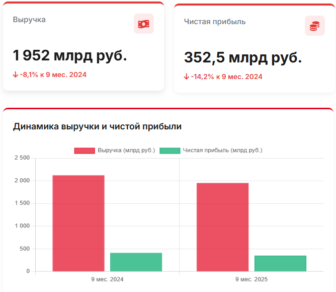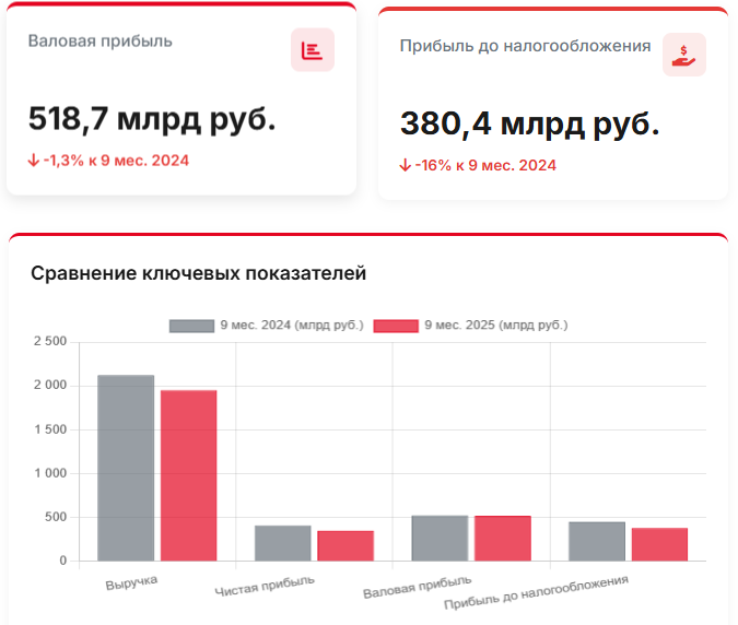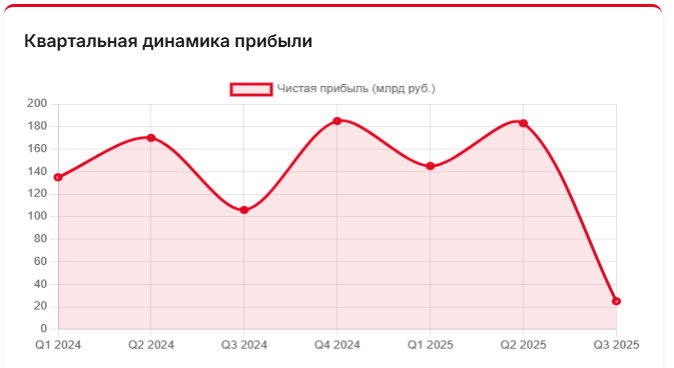 Резкое снижение чистой прибыли в третьем квартале 2025 года стало основным драйвером общего падения показателя за 9 месяцев. Прибыль за июль-сентябрь составила всего 24,7 млрд руб. против 105,8 млрд руб. годом ранее.