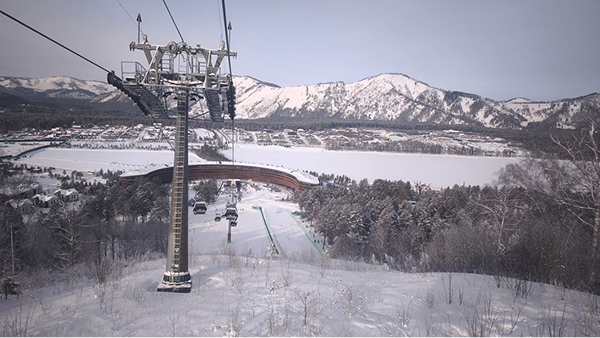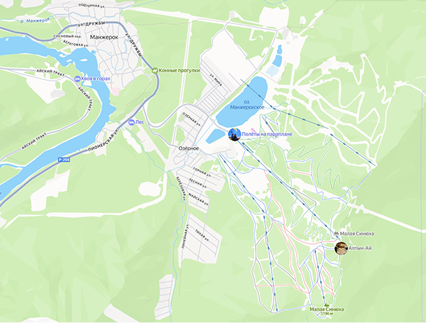 Манжерок находится в получасе езды от Горно-Алтайска на небольшой по сравнению с кавказскими горнолыжками высоте — около 300–400 метров над уровнем моря внизу. 1240 — верхняя точка канатки. То есть, примерно как BigWood в Кировске. Пейзажи с высоты чем-то похожи, но лишь отдалённо. Всё остальное вообще по-другому.