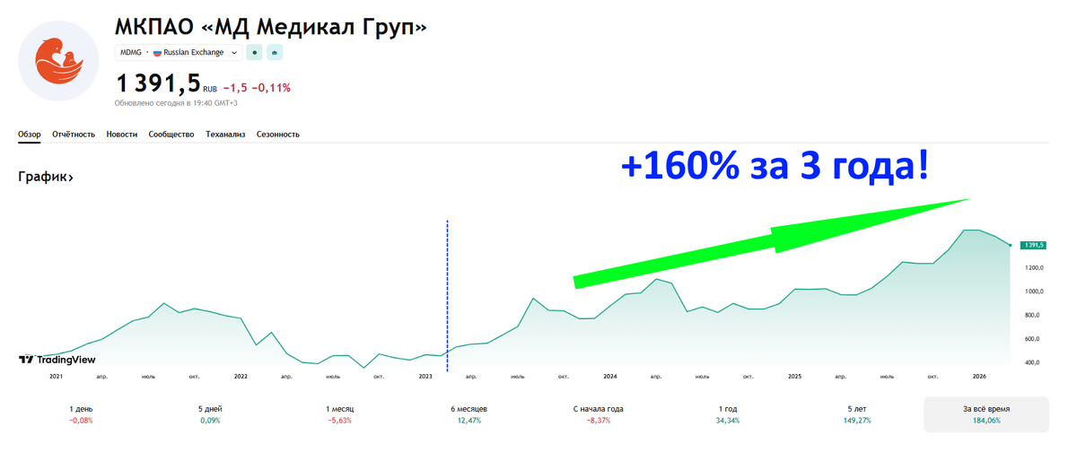 Друзья, сегодня разбираем одну интересную акцию — MD Medical Group, она же «Мать и дитя» $MDMG . Компания недавно отчиталась за 2025г. Давайте без воды: что с котировками, что с бизнесом, что с дивидендами!