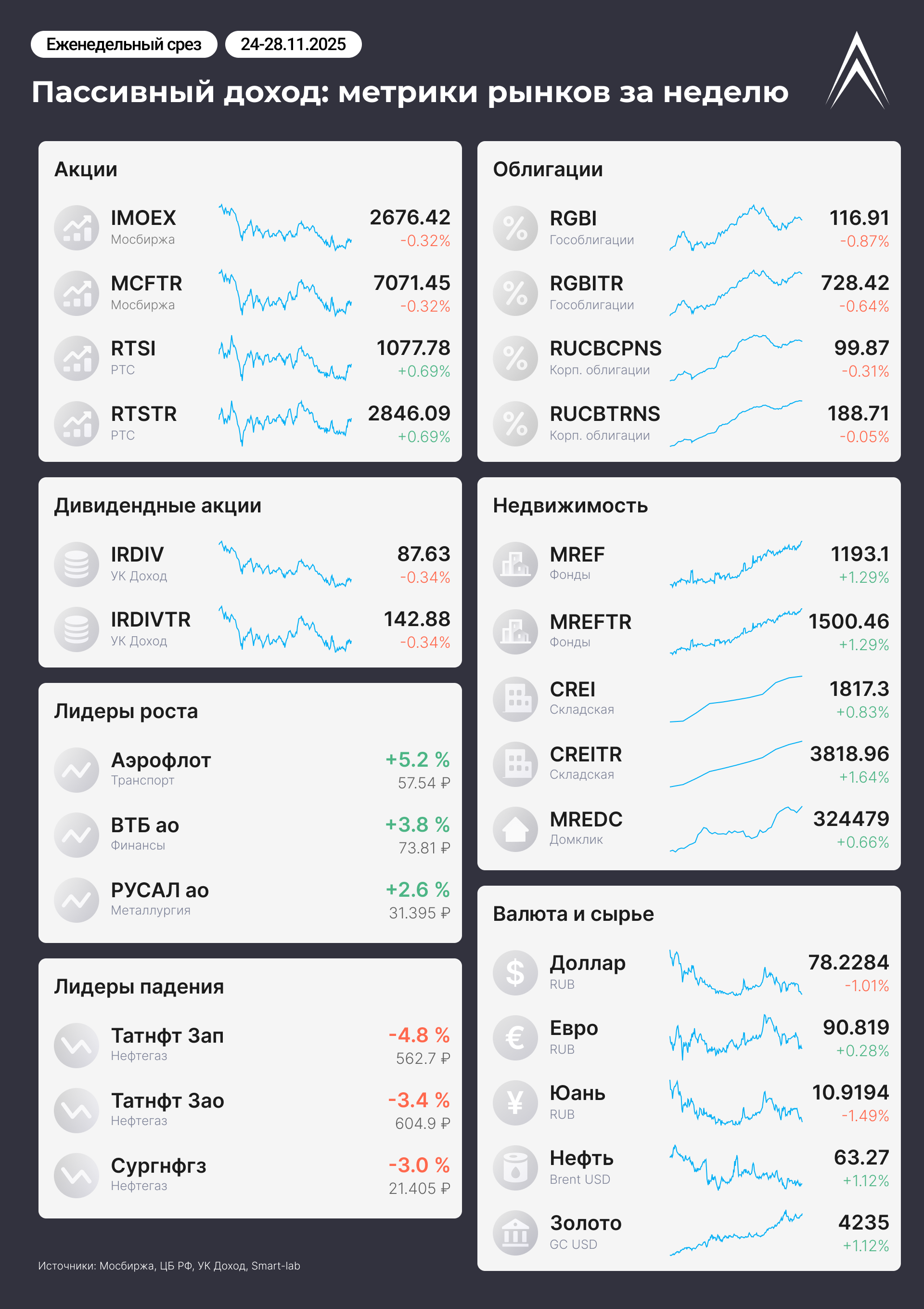 Привет, инвесторы! Готова свежая инфографика от канала «Пассивный доход» — для всех, кто ценит дивиденды, купоны и рентные платежи, в общем любит, когда деньги работают сами. Собрал самые важные цифры недели, чтобы быть в теме и держать руку на пульсе.