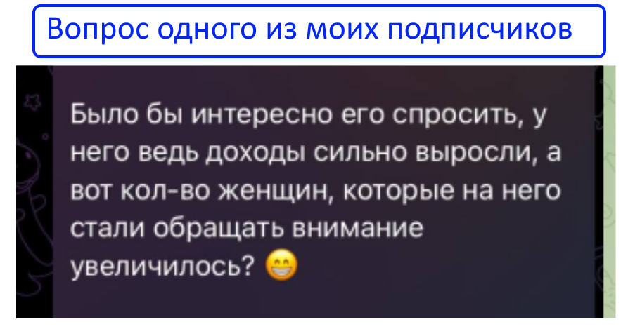 Для привлечения внимания женщин часто важнее не то, сколько ты зарабатываешь на самом деле, а то, какой уровень дохода можешь транслировать на публике. Другими словами, достаточно просто выглядеть богатым. Новый айфон, престижная машина, брендовая одежда создают образ успешного человека (даже если все это в кредит) и куча женского внимания обеспечена. Но я таким не занимаюсь!