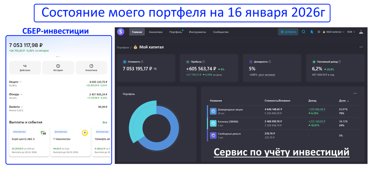 Например, сейчас у меня в инвестициях более 7млн р (скрин портфеля из приложения СБЕР инвестиции и сервиса учёта инвестиций):