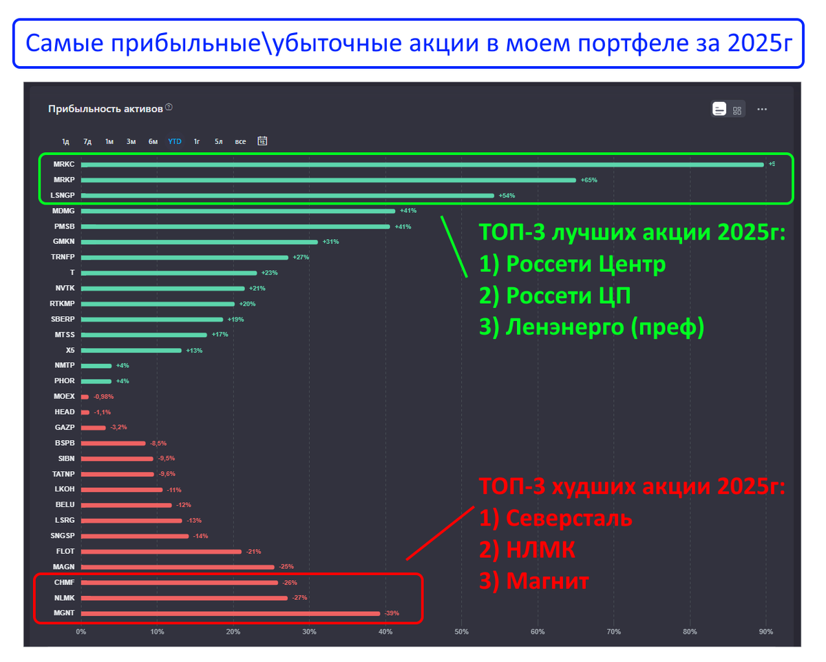 Какие акции принесли больше всего прибыли\убытка в 2025г?