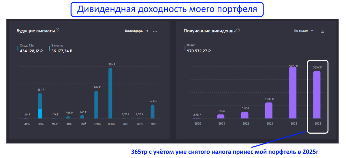За 2025г мои дивидендные активы (4.8 млн р из общего портфеля) принесли 365 тр. Впервые за 6 лет инвестирования я получил меньше, чем годом ранее (в 2024-м было 397 тр при портфеле в 4 млн р).