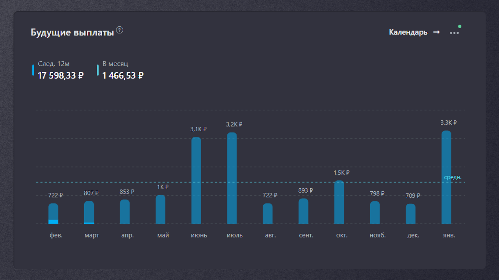 Каждый месяц будет купон по ОФЗ (у меня их 6 с выплатами в разные месяцы), плюс ежемесячные или квартальные купоны по корпоративным облигациям (это Самолет, ВУШ, ПКТ и Атомэнергопром), а еще фонды недвижимости с ежемесячной рентой (кроме РД ПРО, там квартальные).