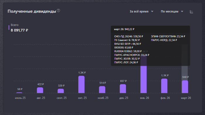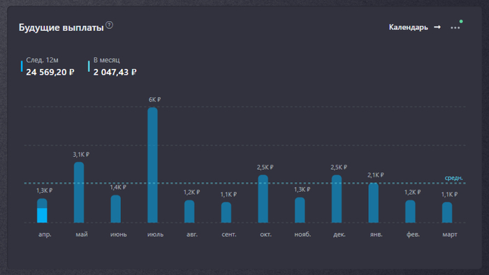 В марте дивидендов не получал, но это нормально — акции не зарплату ежемесячную платят ведь.