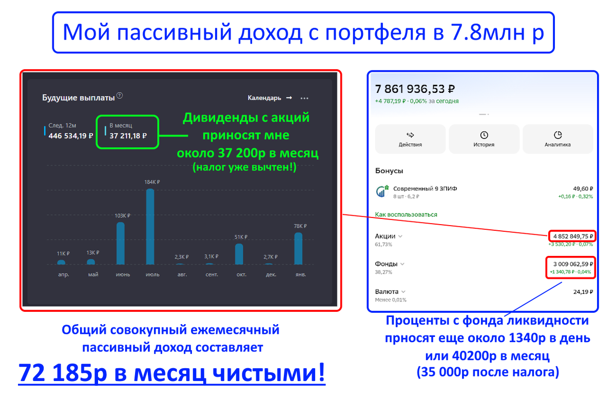 Самое приятное в инвестициях — это когда твой портфель начинает работать на тебя! После сегодняшнего пополнения мой чистый пассивный доход - это дивиденды с акций и проценты с фонда ликвидности SBMM, вырос до 72 000р в месяц (сумма с учетом всех снятых налогов):