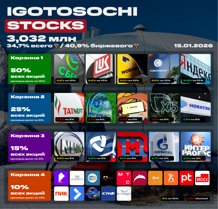 Акции занимают 34,7% от всего портфеля (актуальный отчет будет 1 февраля, не пропустите). Если взять только биржевой (без депозитов), это 40,9%. Целевая доля акций в биржевом портфеле 40%, реальная чуть выше.
