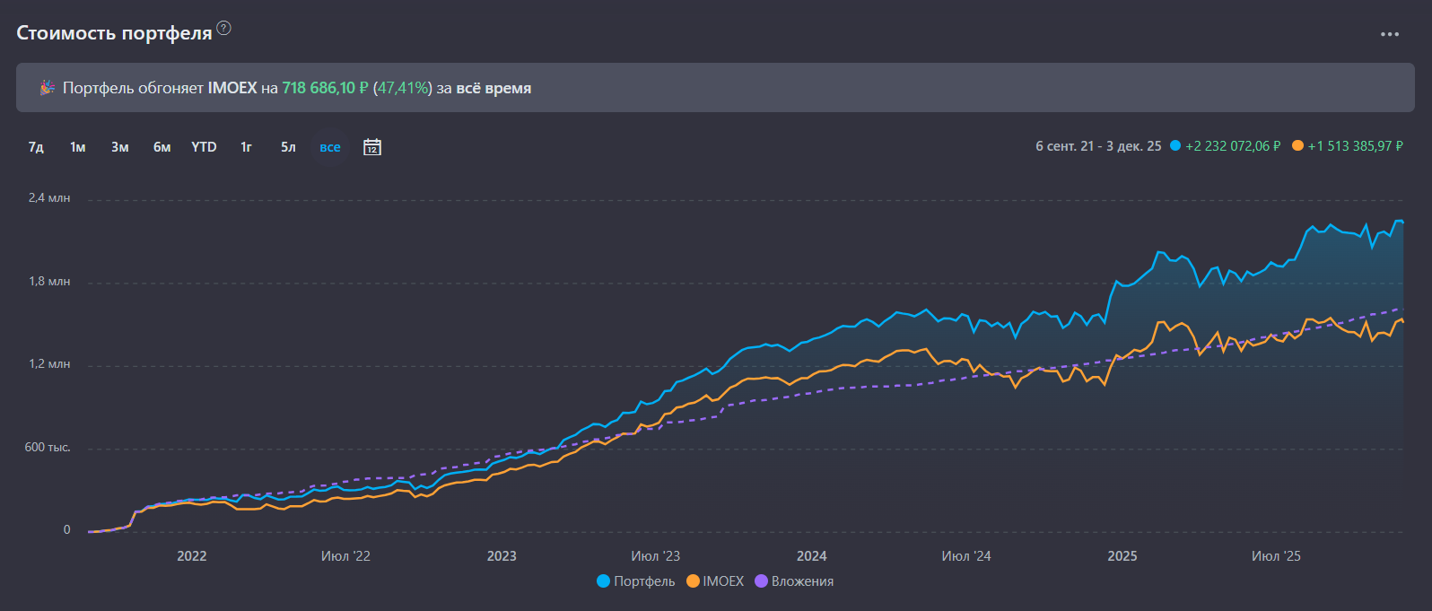 Веду невидимый бой с тенью под названием «Портфель VS IMOEX». За все время моего инвестирования, мой портфель обгоняет индекс на 718 686 ₽ или +47%. В какой-то момент мой портфель оторвался от индекса и эта тенденция сохраняется.