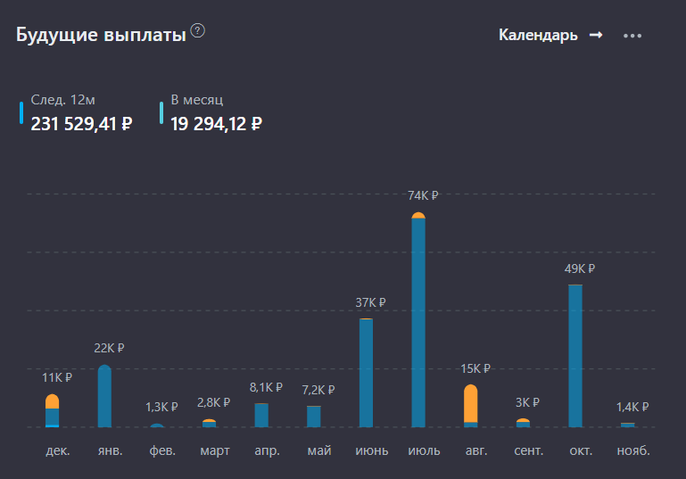 Выплаты на ближайшие 12 месяцев - это прогноз, в реальности может быть больше, а может и не быть, но держать, как ориентир, вполне приемлемо. В конце года посчитаю, сколько получилось за 2025 год, прогноз был 216 000 ₽, на данный момент вышло 146 559 ₽.