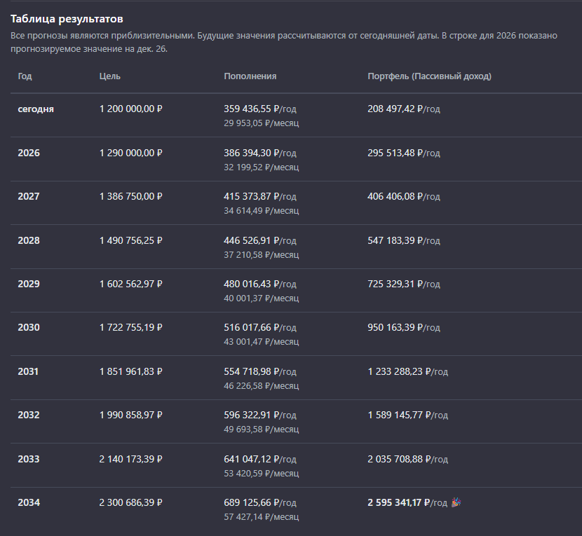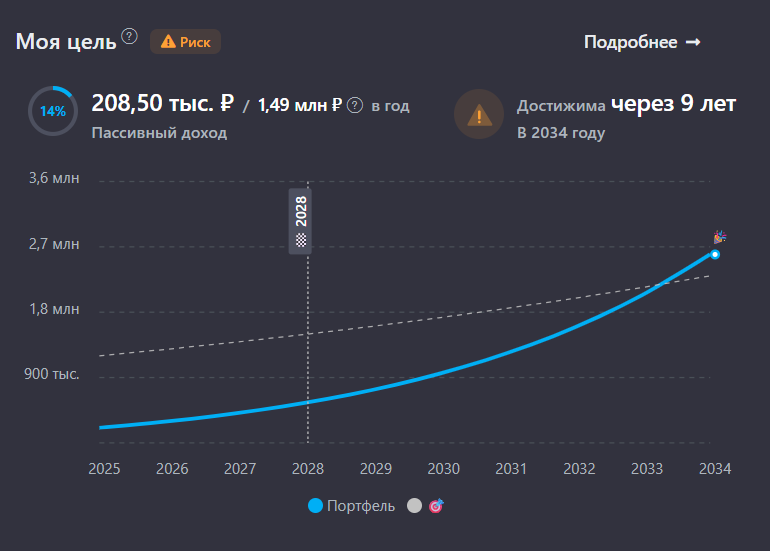 Промежуточная цель, к которой я стремлюсь – это 1 000 000 рублей дивидендами и купонами в год с учетом инфляции. По данным сервиса учета инвестиций, цель будет достигнута в 2034 году.