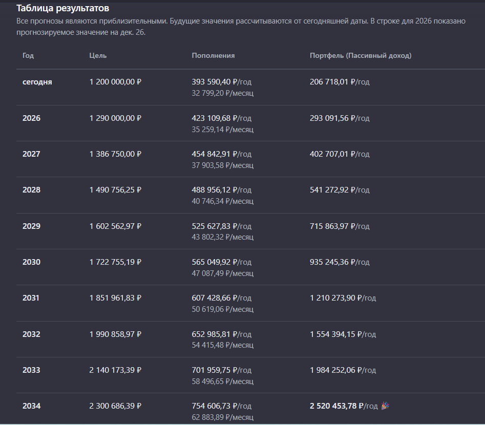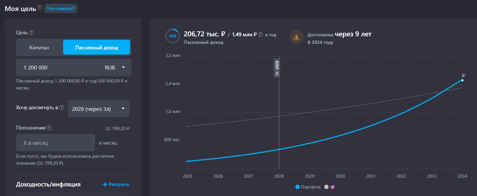Промежуточная цель, к которой я стремлюсь – это 1 200 000 рублей (или 100 000 ₽ в месяц) дивидендами и купонами в год с учетом инфляции. По данным сервиса учета инвестиций, цель будет достигнута в 2034 году.