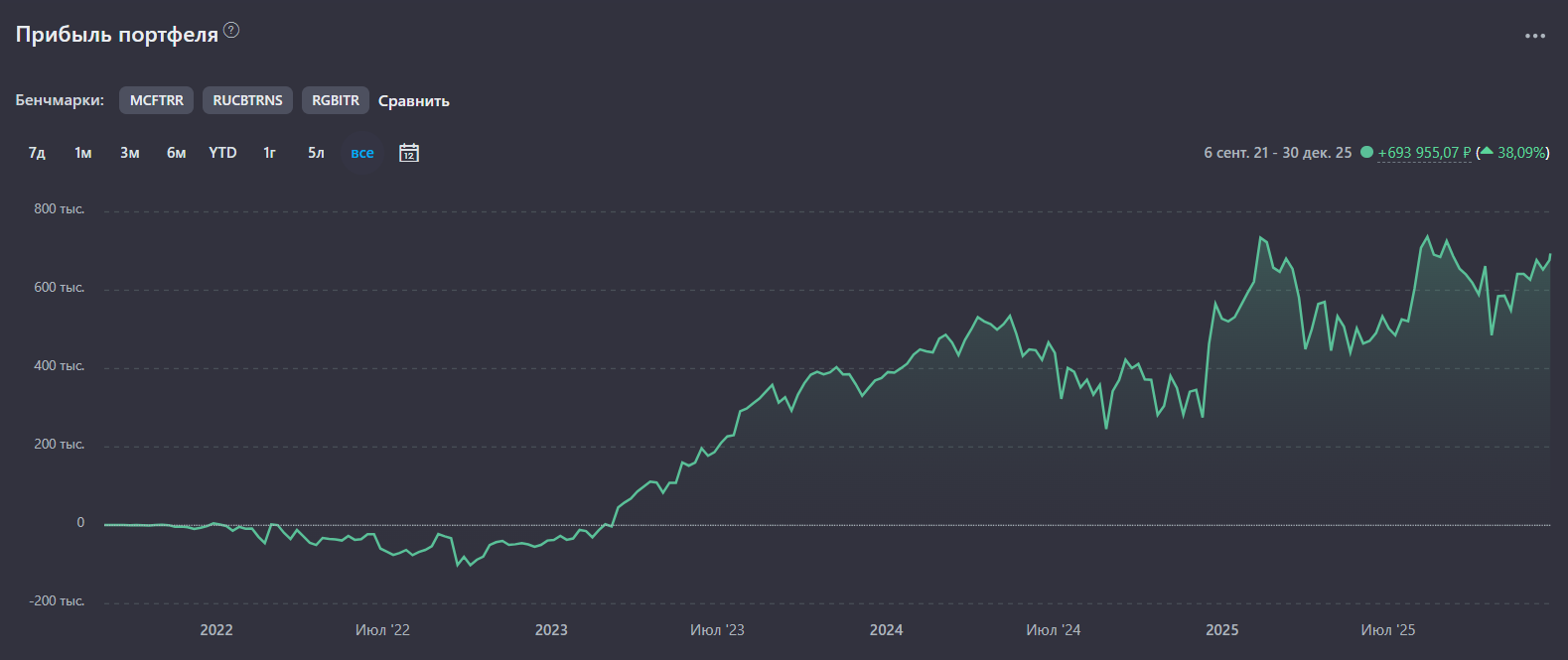 Прибыль моего портфеля за все время моего инвестирования составляет 694 000 ₽. Такой результат получился за счет регулярных еженедельных покупок, как на хаях, так и на низах, в итоге получалось что-то среднее. Если бы обладал хрустальным шаром, тогда бы бабушка была бы дедушкой.