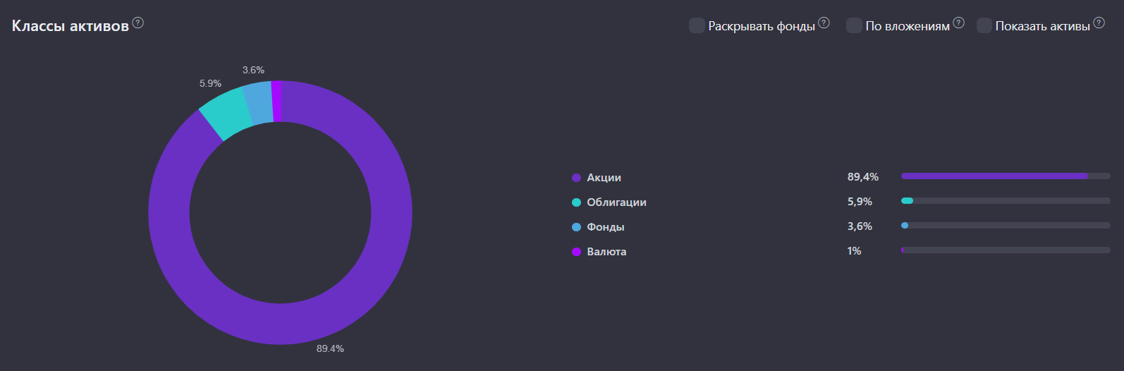 До недавнего времени был в акциях на 100%. Портфель претерпел небольшие изменения, выделил 10% под облигации для создания постоянного денежного потока, золоту выделено 5%, как защитному и растущему (на длинной дистанции) активу, таким образом распределение активов будет выглядеть следующим образом: