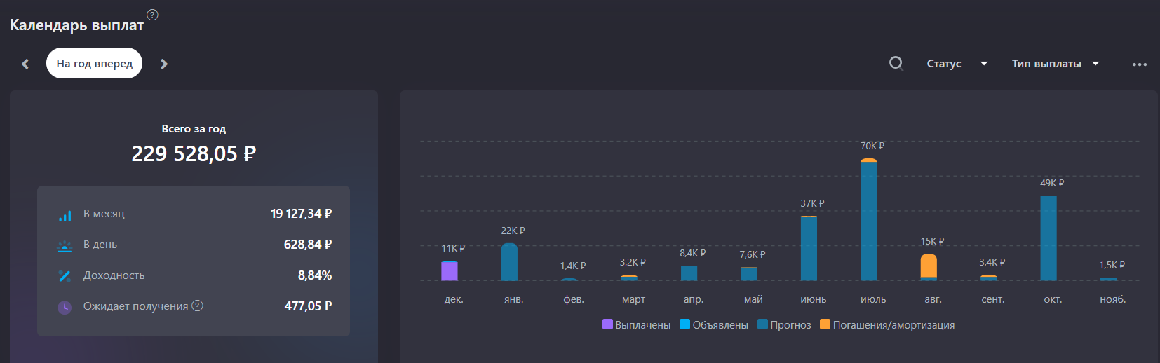 По прогнозам на следующие 12 месяцев мой портфель наполнится на общую сумму 206 000 ₽. С этой отправной точки и поедем в новый год, чтобы постараться обогнать данное значение.
