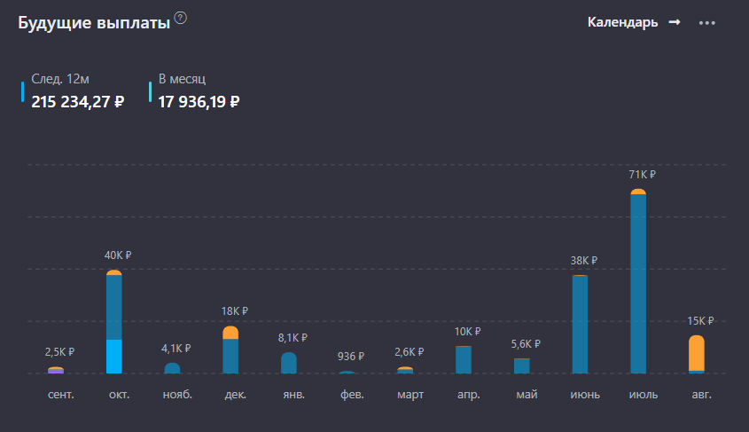 Выплаты на ближайшие 12 месяцев - это прогноз, в реальности может быть больше, а может и не быть, но держать, как ориентир, вполне приемлемо. В конце года посчитаю, сколько получилось за 2025 год, прогноз был 216 000 ₽, на данный момент вышло 108 865 ₽, подробно про пассивный доход за 8 месяцев 2025 года.