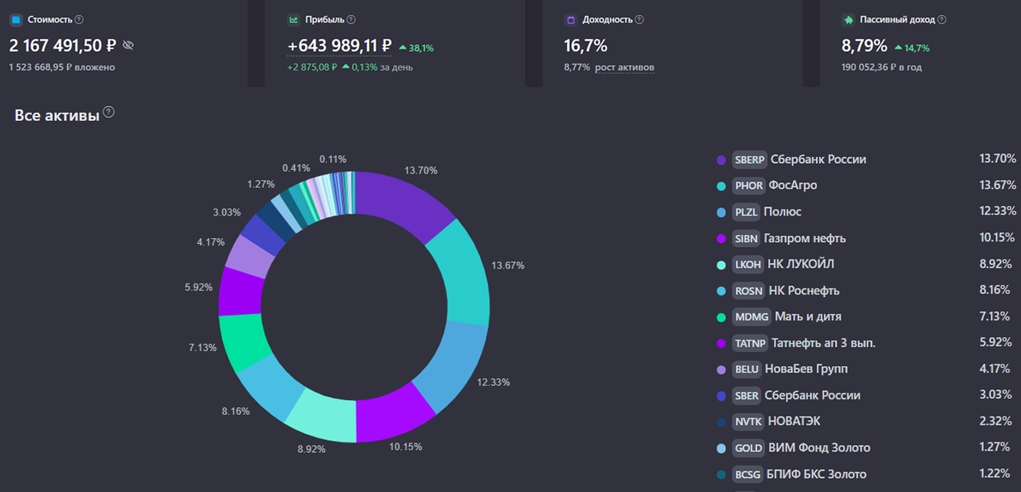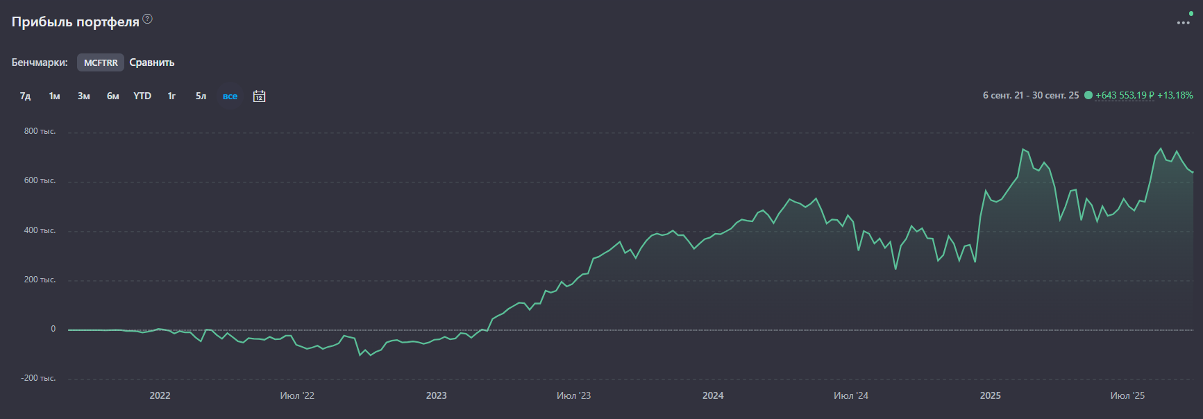 Прибыль моего портфеля за все время моего инвестирования составляет 643 551 ₽. Сюда входят, как полученные дивиденды и купоны, так и бумажная прибыль, которую я не зафиксировал. Показатель постоянно пляшет из-за волатильных акций, по в последнее время радует.