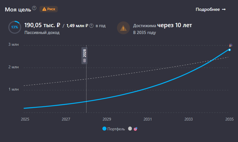 Промежуточная цель, к которой я стремлюсь – это 1 000 000 рублей дивидендами и купонами в год с учетом инфляции. По данным сервиса учета инвестиций, цель будет достигнута в 2035 году. также наблюдается отрицательный рост и в промежуточной цели. Еще в начале года сервис рисовал 2031-й год, сейчас 2035-й. Тут помогут регулярные пополнения, которые со временем собираюсь только увеличивать.