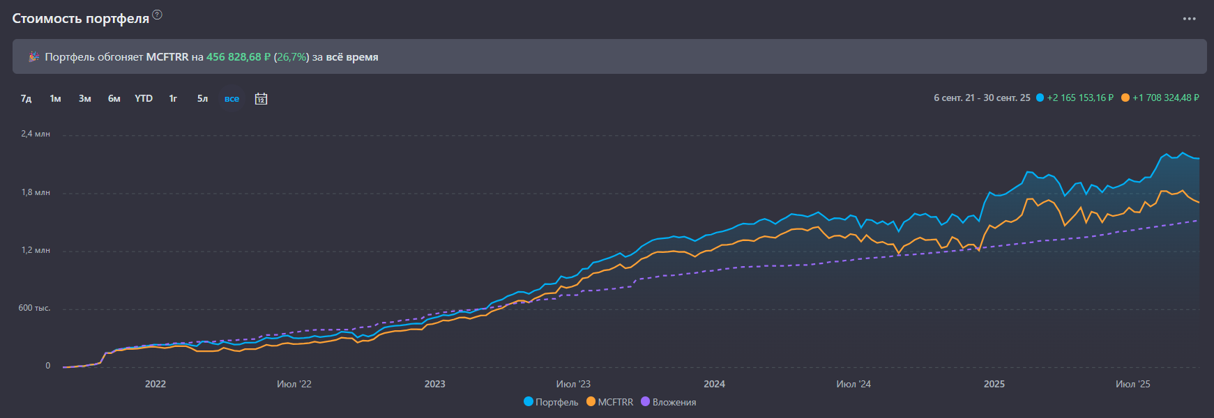 Веду невидимый бой с тенью под названием «Индекс Московской биржи полной доходности». За все время моего инвестирования, мой портфель обгоняет индекс на 456 828 ₽ или +26,7%. В какой-то момент мой портфель оторвался от индекса и эта тенденция сохраняется.