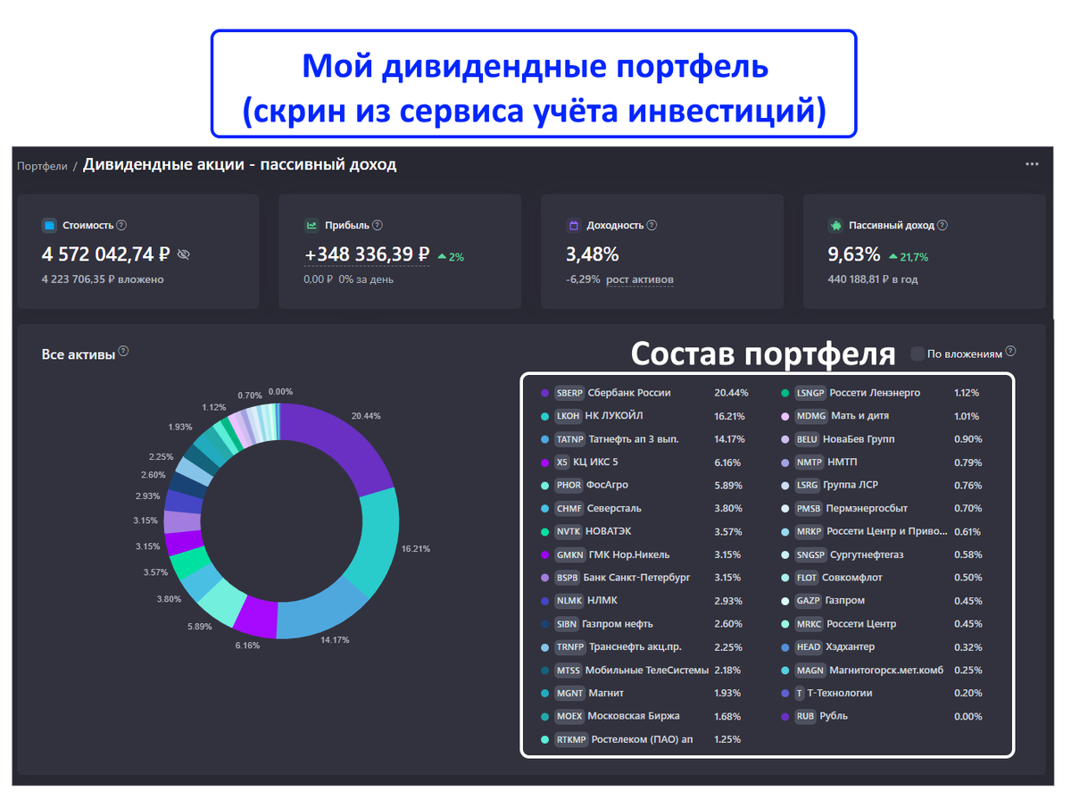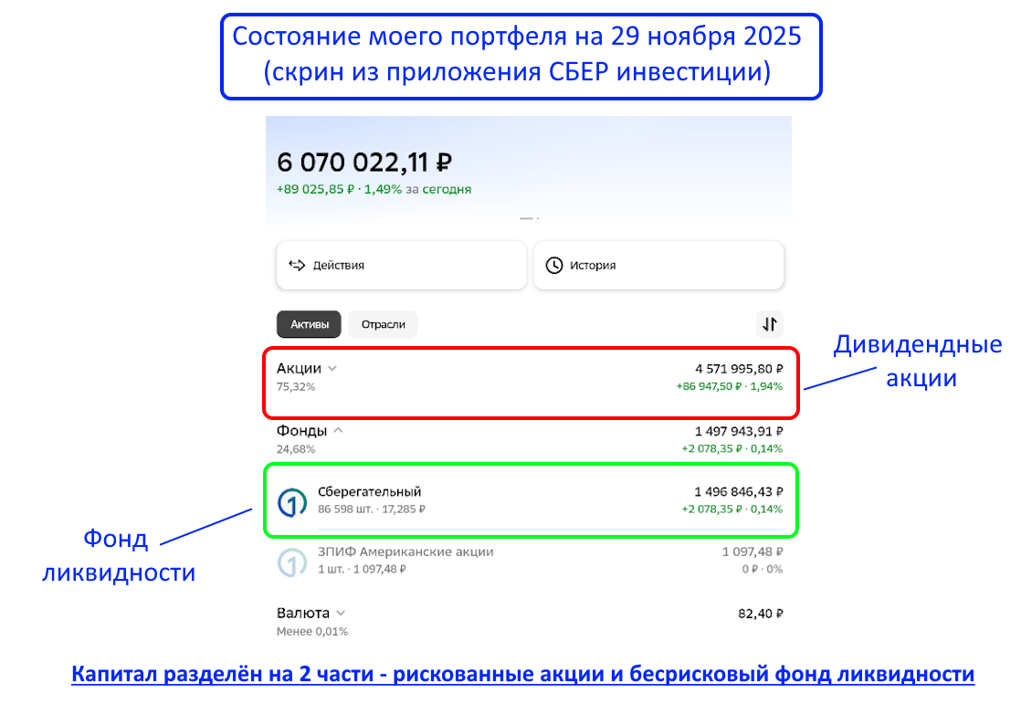 Общая сумма инвестиций в рынок у меня составляет 6млн р. Сам портфель разделен на две части, каждая из которых генерирует пассивный доход: