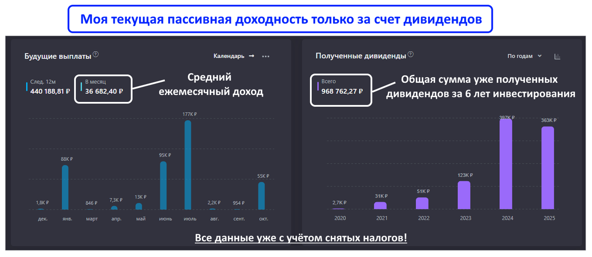 Доходность: дивиденды приносят ~36 700р в месяц после всех налогов.