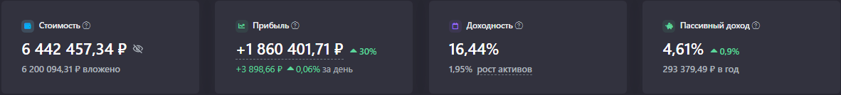 Хоть план не выполнен, но портфельчик-то вырос. На 1 января 2025 его стоимость была 5,153М, сегодня же наблюдаю цифру 6,440М. Пассивный доход всего прошлого года — 626 тысяч рублей, в 2024 году было 470 тысяч рублей.