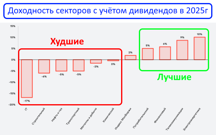 Из 10 секторов рынка положительную доходность (с учётом дивидендов) показали только 4, и все они обогнали индекс МосБиржи: