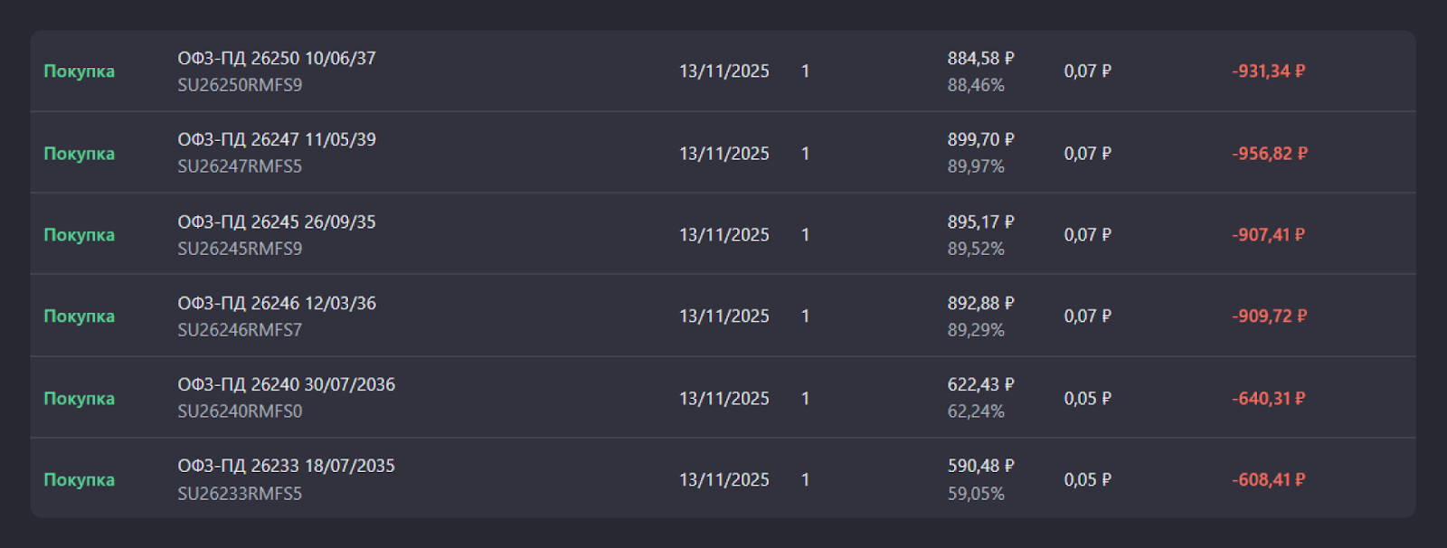 Тут по классике. Снова взял 6 длинных ОФЗ, как и собирался, — так, чтобы выплаты шли ЕЖЕМЕСЯЧНО. По одной штуке: 26233, 26240, 26246, 26245, 26247, 26250.