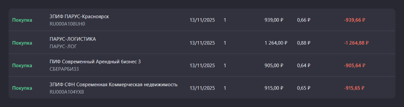 Итого, докупил по 1 паю ЗПИФов СКН Коммерческая недвижимость, СКН Современный арендный бизнес 3 и Парус-Красноярск.