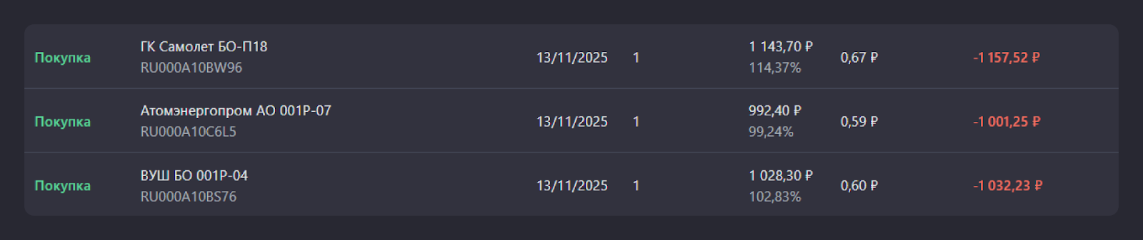 Здесь тоже всё по плану и без сюрпризов. Взял ещё по одной облигации «великой троицы», которая у меня в портфеле корпоратов: ВУШ 1P4, Самолет Р18 и Атомэнергопром 1Р7. Предельно скучно, но доля риска в самолетах и самокатах присутствует. Атом надежнее некуда.