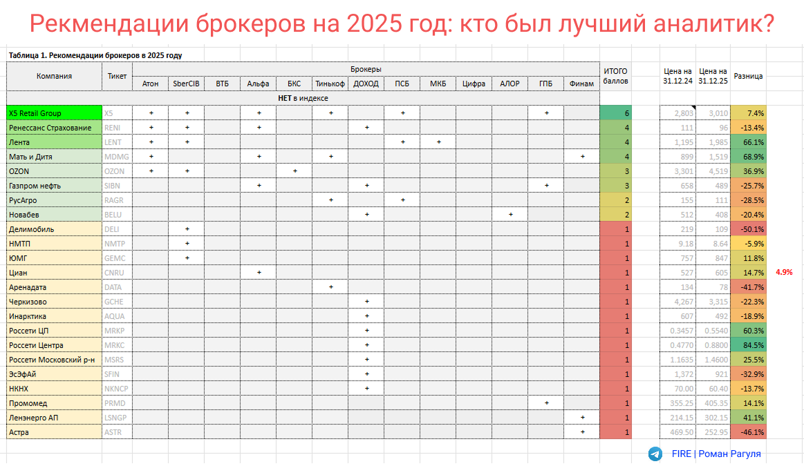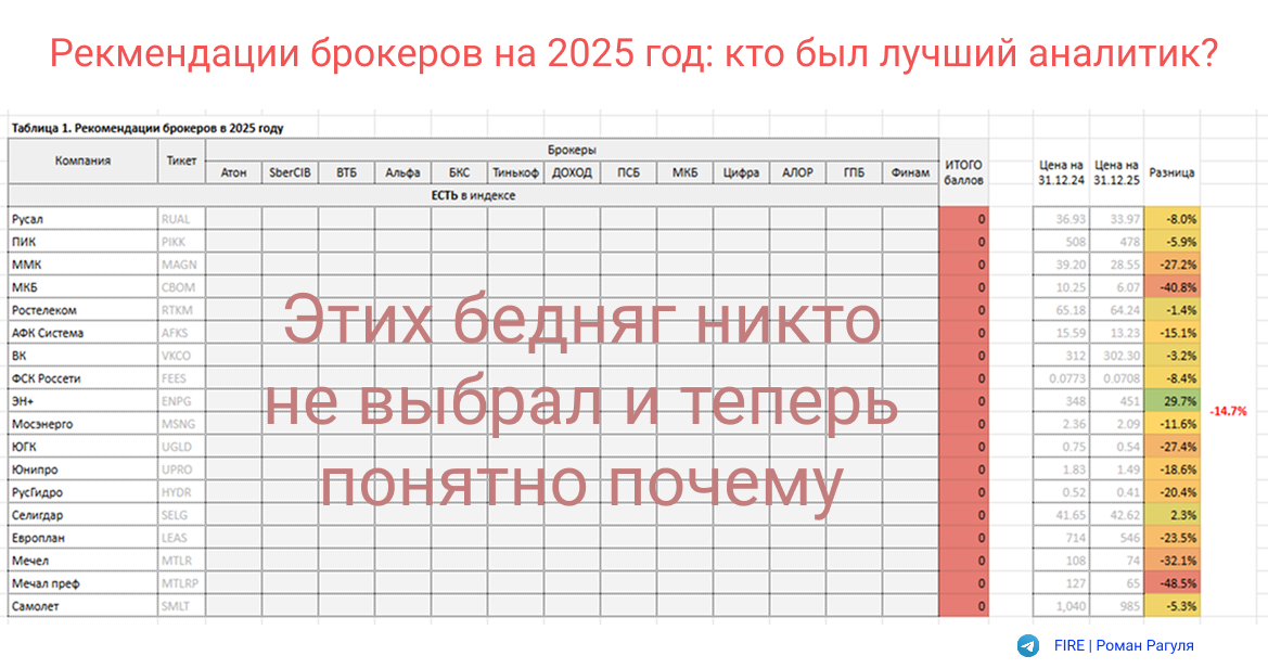 В начале 2025 года я прочитал всю аналитику брокеров с прогнозами на уже прошедший год, собрал табличку консенсуса, выделил фаворитов в акциях и сделал свою ставку (пальцем в небо, как показала практика аналитики делают также).
