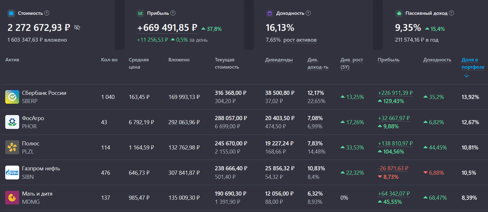 Мой портфель и ТОП-5 активов в нем