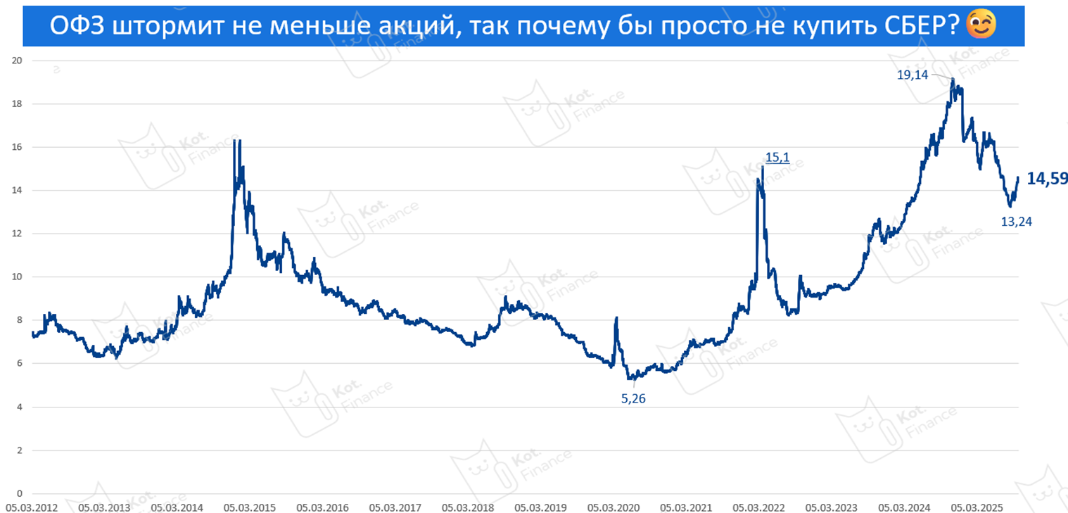 Сегодня эффективная доходность гос.облигаций на уровне 14,5%, что по историческим меркам очень много. У рынков короткая память и мало кто помнит, что совсем недавно (2020 год) доходность спускалась до 5% а вклады давали скромные 3-4%. Даже после начала СВО доходность ОФЗ длительное время была 8-10%. Но что даёт эта ностальгия сейчас?