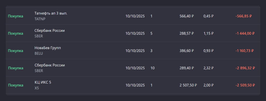 Портфель у меня был почти 59 000 рублей (просадка коснулась и меня), если совсем точно, то за день до пополнения было 58 927 ₽. Как и планировал, только получил зарплату, сразу пополнил счет на +20 000 ₽. Все покупки совершены 10 октября.
