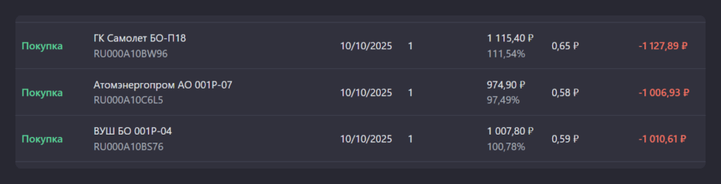 Здесь тоже всё по плану. Взял ещё по одной облигации «великой троицы», которая у меня в портфеле корпоратов: ВУШ 1P4, Самолет Р18 и Атомэнергопром 1Р7. Предельно скучно, но доля риска в самолетах и самокатах присутствует. Атом надежнее некуда.