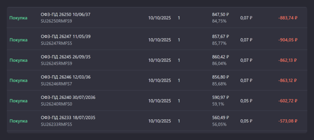 Тут по классике. Снова взял 6 длинных ОФЗ, как и собирался, — так, чтобы выплаты шли ЕЖЕМЕСЯЧНО. По одной штуке: 26233, 26240, 26246, 26245, 26247, 26250.