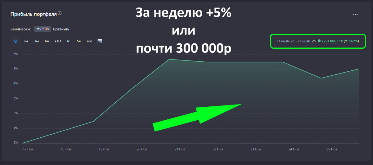 Например, за неделю, на фоне новостей о мирном плане Трампа, мой портфель прибавил около +5% (или почти 300 000р):