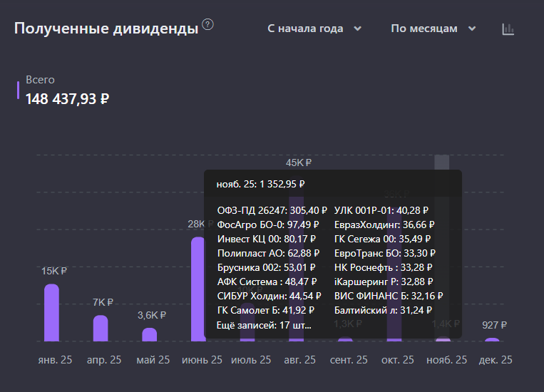 В мае было выделено под облигации 10% от портфеля. В ноябре выплаты относительно предыдущих месяцев сократились, но относительно ноября прошлого года, выросли, что не может не радовать.