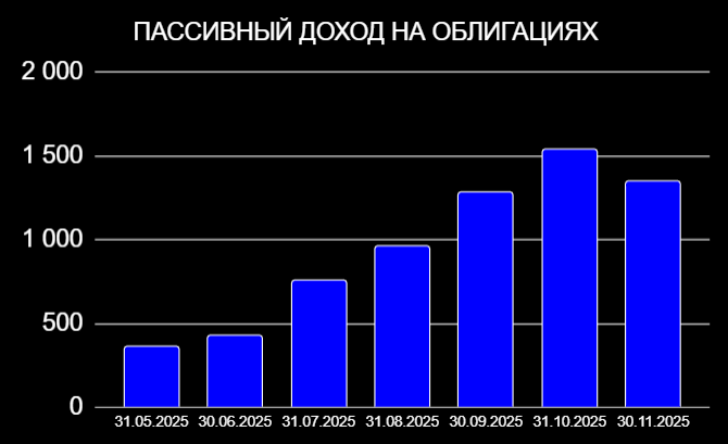 В ноябре приходили только купоны по облигациям. Наш рынок не славится дивидендами в некоторых месяцах, ноябрь – один из них. Именно поэтому я в свое время решил разбавить свой портфель акций облигациями, чтобы можно было получать ежемесячно выплаты с нашей фонды. Зарплатный наркоман требовал этого три года, и наконец, свое получил. Облигациям выделил 10% в портфеле.