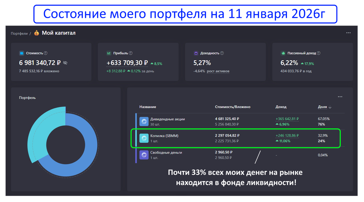 Что делать нам, инвесторам? Укреплять «защиту» портфеля! В периоды неопределенности важно инвестировать в защитные активы. Я активно использую фонды ликвидности, и сегодня более 30% моего капитала работает на меня, принося гарантированный ежедневный доход (скрин моего портфеля):