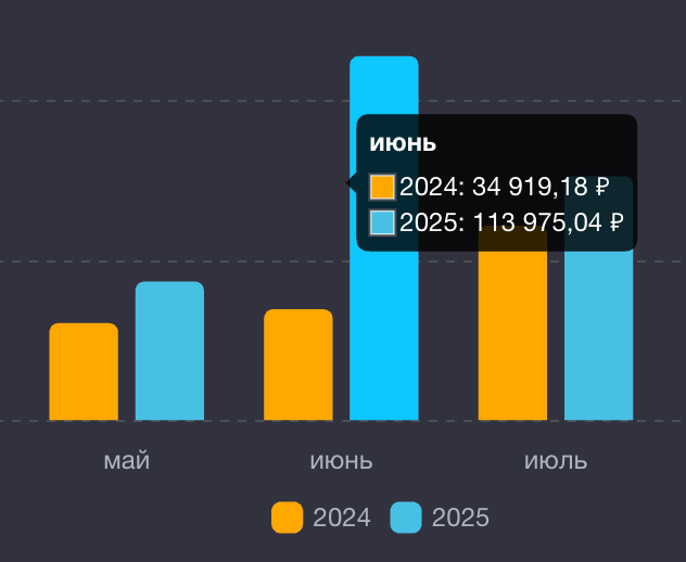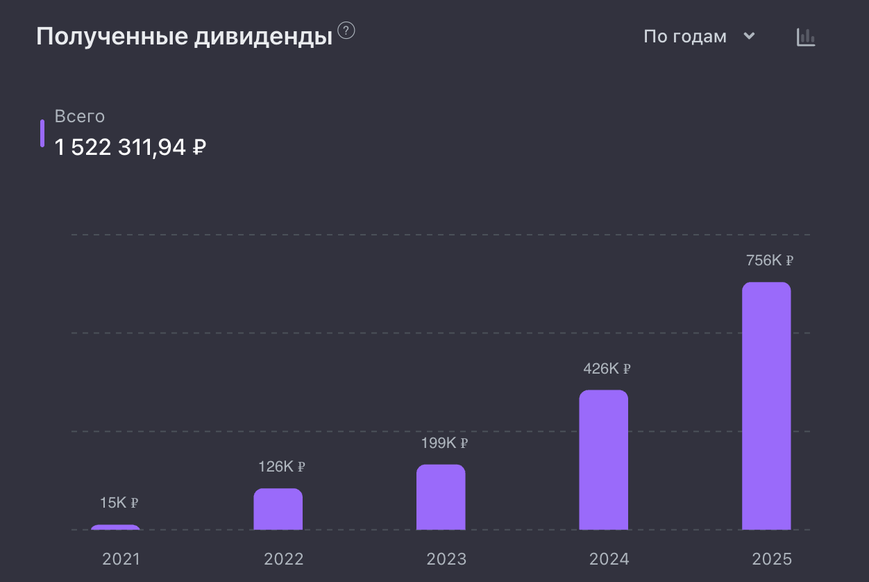 Видно, как выплаты растут год к году. Этого бы не было без регулярных пополнений портфеля. А ещё любопытно, что каждый месяц 2025 был доходнее аналогичного месяца 2024.